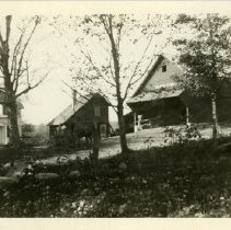 Black and white photograph of Dodge Farm at 45 Sunny Ridge Road in Washington, CT. This may be a view of the house of Dodge Farm manger Angus MacDonell and the barns which burned, rather than a view of Professor Dodge's house. The main house can be seen in the middle-left side of the photograph, while two outbuildings occupy the center and left side of the photo. Three trees stand in front of the buildings, near the edge of what looks like t...