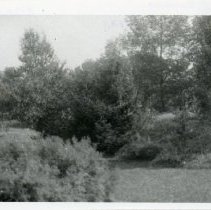 Black and white photographic image of the lawn and trees at Rock Gate. In blue on back: "Seccomb House Lawn" and "P(b) #152"