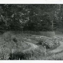 Black and white photographic image of the perennial gardens at Rock Gate. Arched walkways circumscribe the crescent shaped garden bed with mature trees in the background. In blue on back: "Seccomb House Gardens"