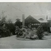 Exterior view of "Seccomb House," also known as Rock Gate at 51 Ferry Bridge Road. Former home of Col. Lucius Barbour and designed by Ehrick Rossiter, c. 1885. In blue ink on back: "Seccomb House", "Drive + Entry", "l890's"