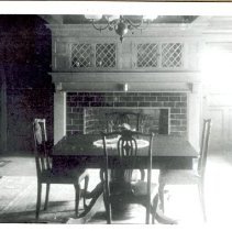 Black and white interior copy photographic print of Rock Gate's dining room. Light streams in from a nearby window onto the square, pedestal dining table with four side chairs centered in the dining room. The wooden side chairs have a squared back with flared ends, five arched rails, and front paw feet. A fifth side chair sits at the end of a buffet against the wall. The small room with low beamed ceiling and dark wood wainscoting features a ...