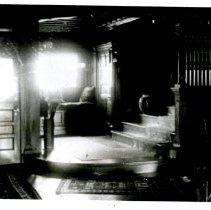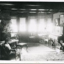 Interior black and white copy photographic print of Rock Gate. The upright piano with elaborate curved legs is the focus of "the music room." Side chairs and small tables skirt the room as light streams in from the bay window awaiting a captive audience.The beamed ciling is low over the paneled walls, detailed carpets scatter across the hardwood floor. Three framed paintings hang above the piano. In blue ink on back: "Seccomb House, Musi...