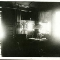 Black and white interior copy photographic print of Rock Gate. A small, round, pedestal table with rocking chairs fills the corner of the dark paneled library. Built in bookcases,open on the bottom and closed with diamond paned doors on top extend 3/4 up the wall. The ceiling appears arched. A large, banquet lamp sits centered on the table among books and a vase of fresh floweres. In blue ink on back: "Seccomb house - 1890's, Library"