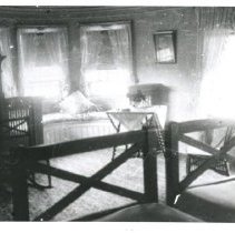 Black and white copy photographic print of a Rock Gate bedroom. A small bedroom with two twin beds. The bed frames are simple with an "X" forming the footboard. The room is also furnished with a rocking chair, spindle table and occasional chair. Separated by spindled balusters, an arched wall filled with lace draped windows, is fitted with a window seat decked in striped ticking. In blue ink on back: "Seccomb House, 1890's, Bedroom" PBR...
